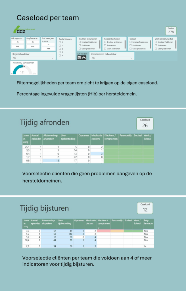 - Tijdig bijsturen – signaleert cliënten (cliënten die al langer in zorg zijn (minstens twee jaar), verschillende soorten medicijnen gebruiken, meer dan 25 zorguren per jaar ontvangen en minstens één zorg afstemmingsgesprek/MDO per maand hebben of een keer zijn opgenomen in het afgelopen jaar) die op basis van de uitkomsten uit herstelvragenlijsten stagneren.